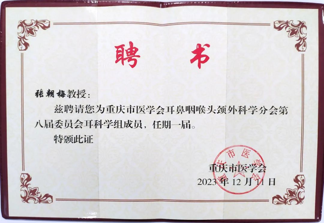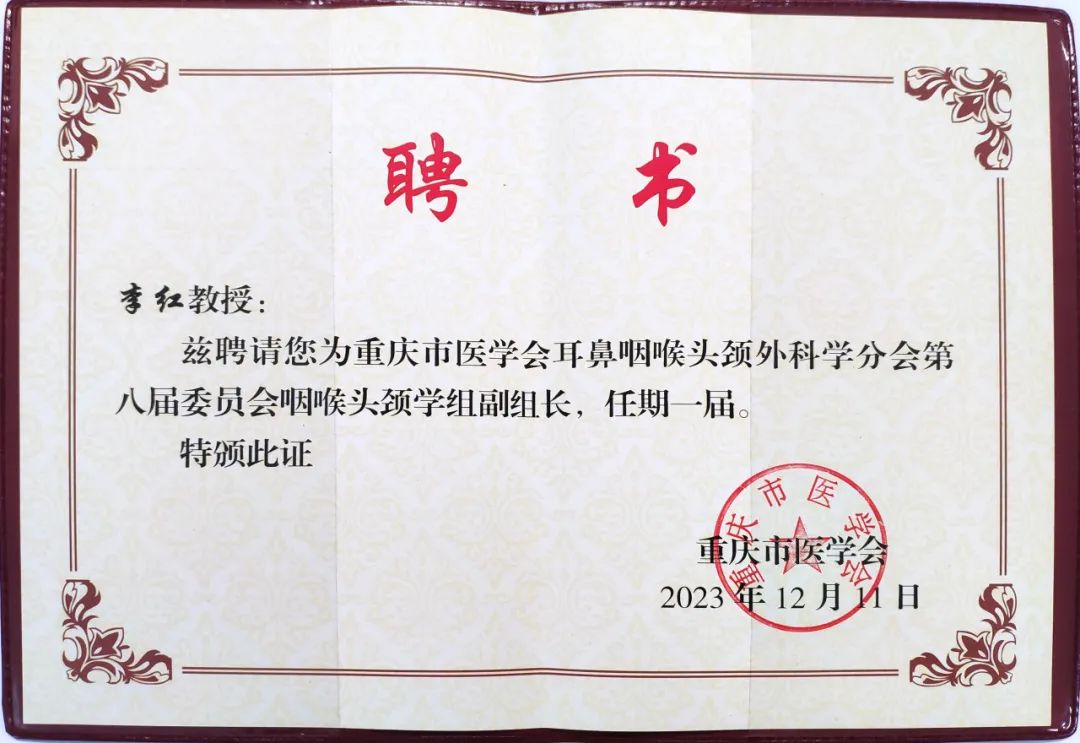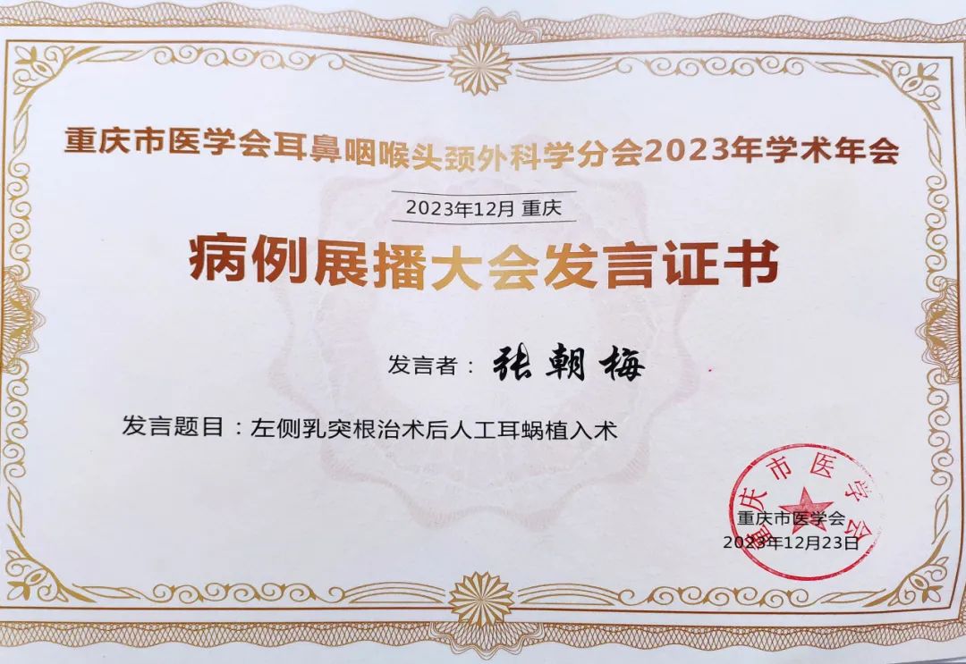 为加快重庆市耳鼻咽喉头颈外科学的发展,促进新技术、新理念在耳鼻咽喉头颈外科学领域内的应用及推广,12月23日,由重庆市医学会主办的重庆市医学会耳鼻咽喉头颈外科学分会2023年学术年会在渝隆重举行,我院院长李红教授、耳科主任张朝梅教授参加了此次学术年会。