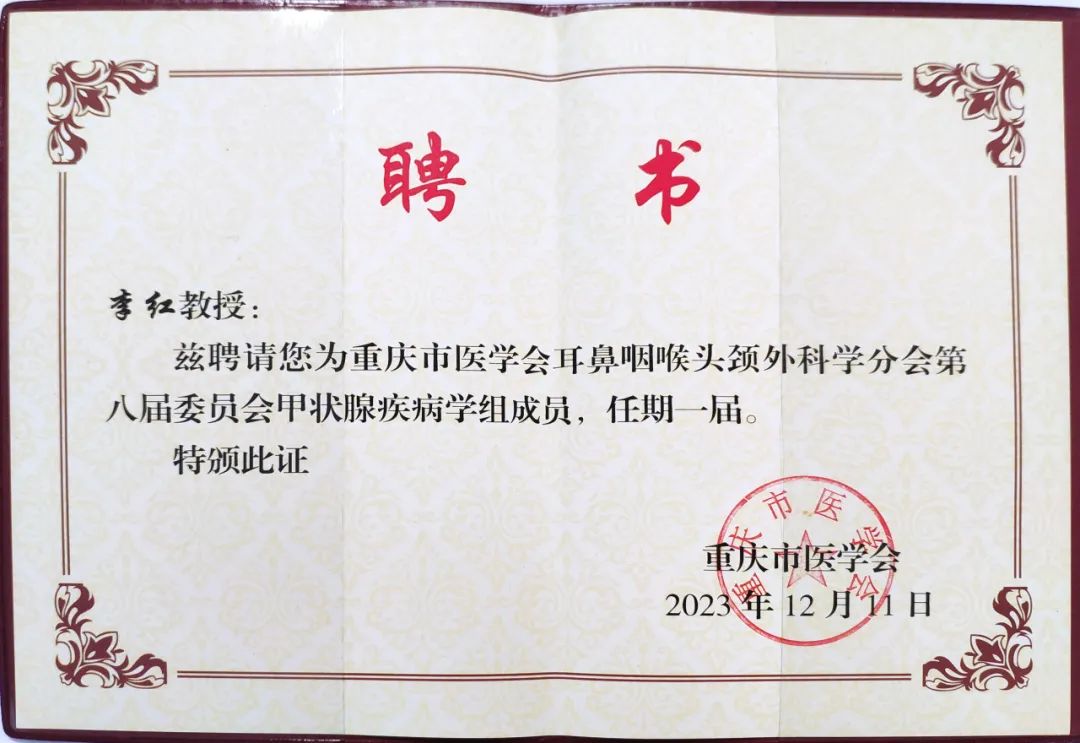 据悉,此次年会还成立了第八届耳鼻咽喉头颈外科学分会及学组,我院院长李红教授被聘请为重庆市医学会耳鼻咽喉头颈外科学分会第八届委员会咽喉头颈学组副组长、重庆市医学会耳鼻咽喉头颈外科学分会第八届委员会甲状腺疾病学组成员,张朝梅主任被聘请为重庆市医学会耳鼻咽喉头颈外科学分会第八届委员会耳科学组成员。