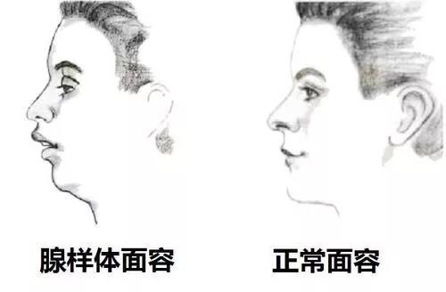 长期张口呼吸,致使面骨发育障碍,颌骨变长,腭骨高拱,牙列不齐,上切牙突出,唇厚,出现“腺样体面容”。
