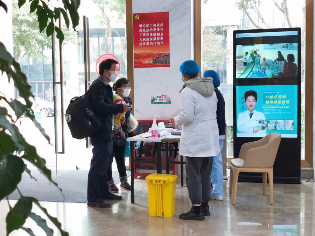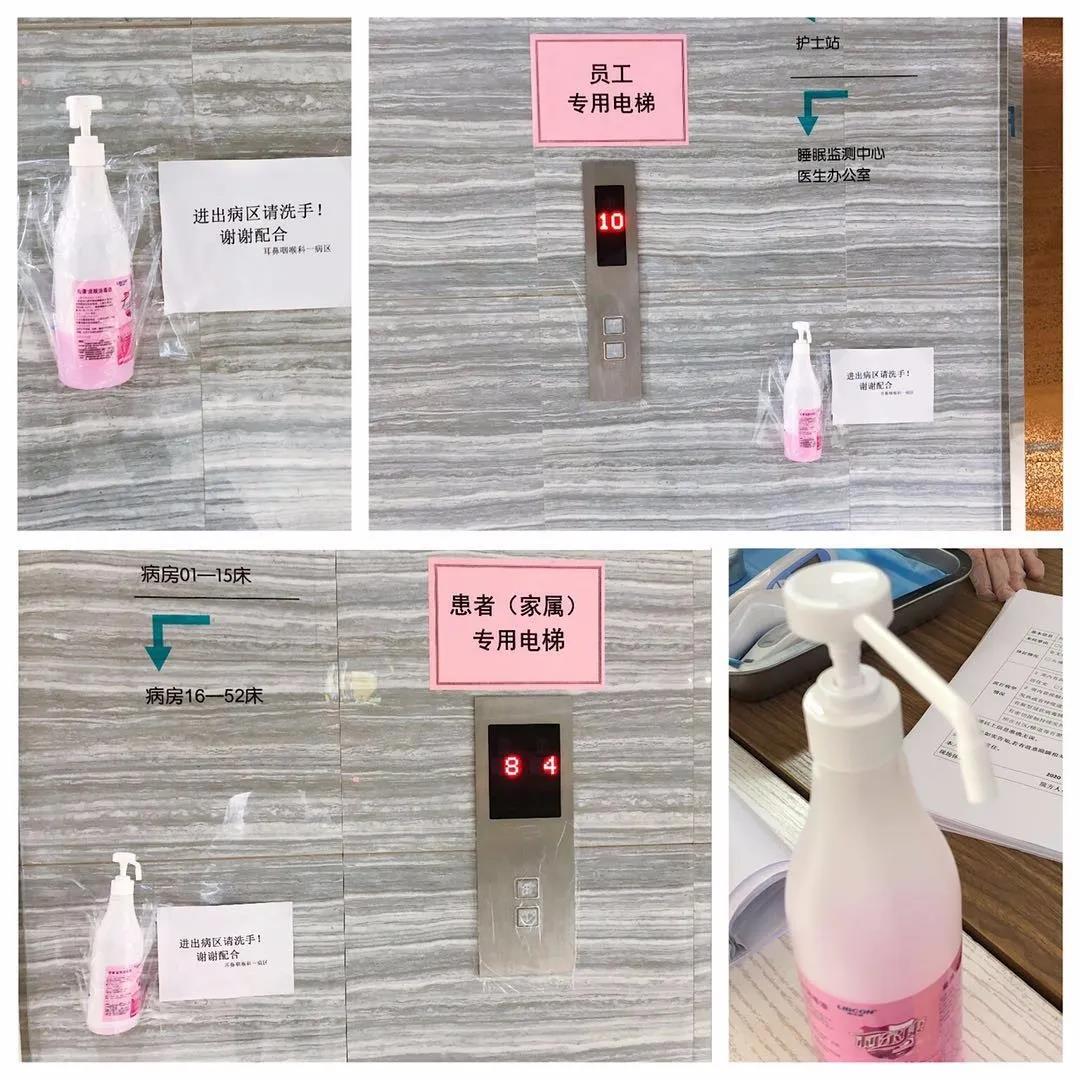 在医院大门处、电梯旁显著位置,摆放有手消毒液,方便患者(家属)和员工随时自行手部消毒。